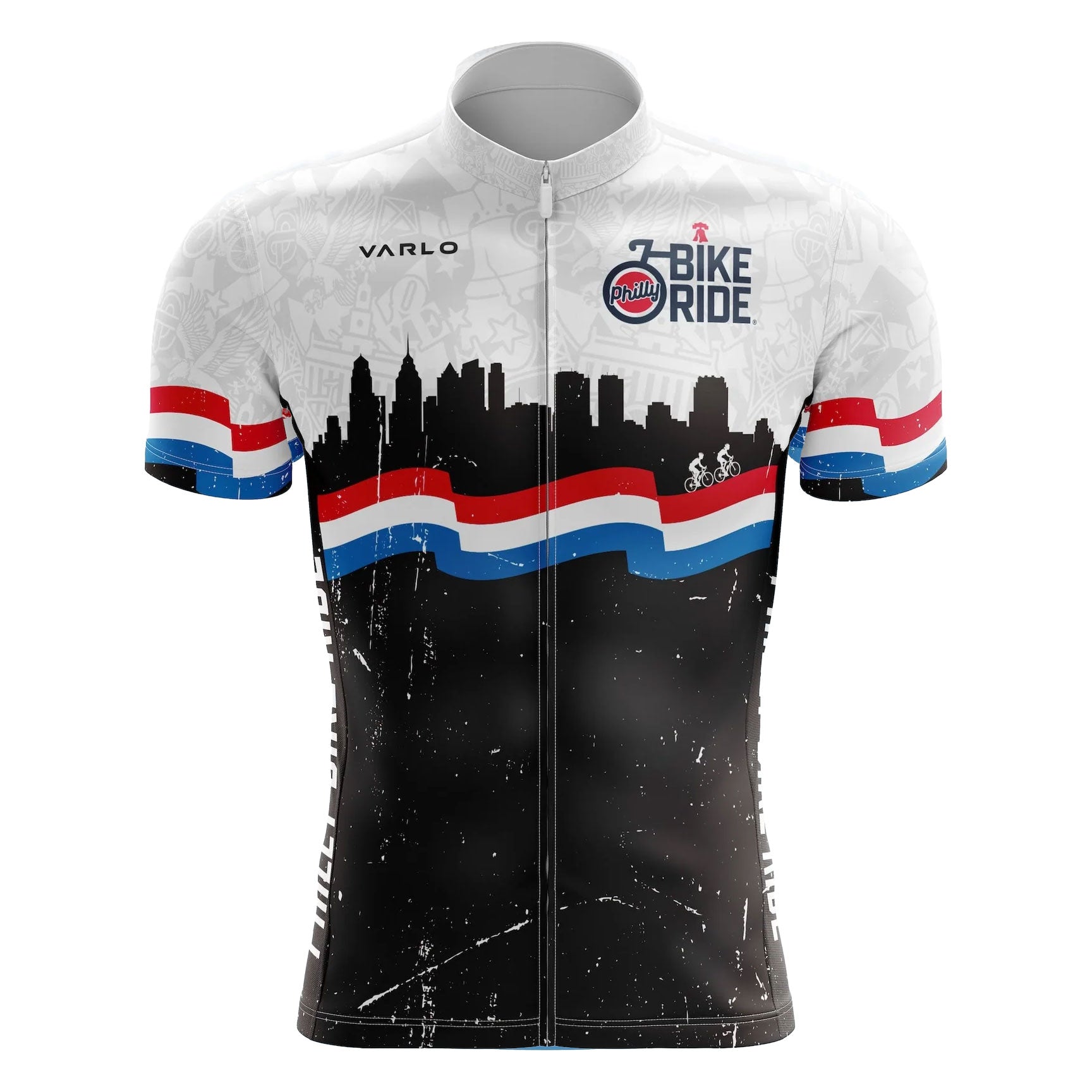 Philly Bike Ride Skyline design. All season performance. Soft core fabric stretches to fit. Reinforced 3 rear pockets. Below waist hem. UPF 15. Race Length sleeves. 4-way stretch. Machine washable delicate cycle 30 C max. Do not bleach, iron, dry clean, or tumble dry. 110 GSM fabric weight. 60% poly / 40% elastane main panels, 80/20 other fabric. Item ID pbov711194m